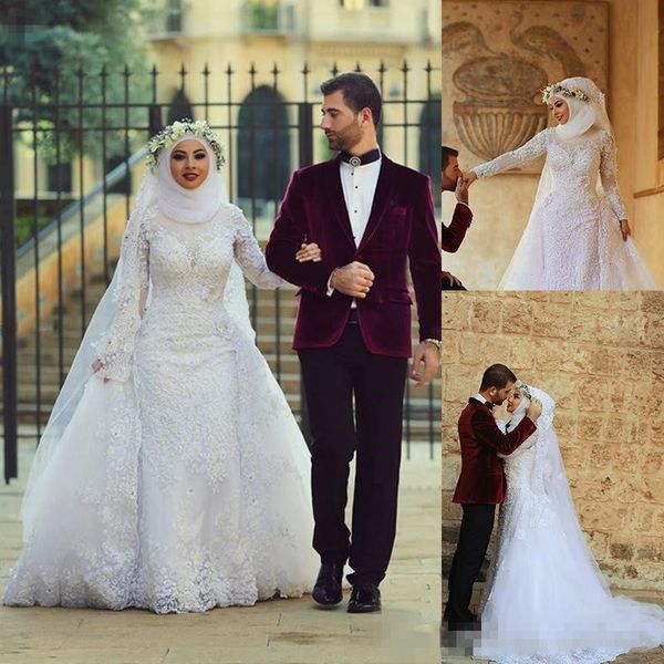 Vintage Bridal Wedding Dresses Arabic Muslim Wedding Gowns With Detachable Train Lace Appliqued Long Sleeves Hijab Wedding Dresses Bridal Lace Budget